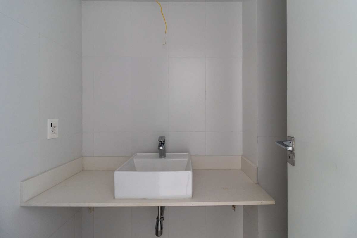 - Banheiro com assento sanitário, bancada e cuba;