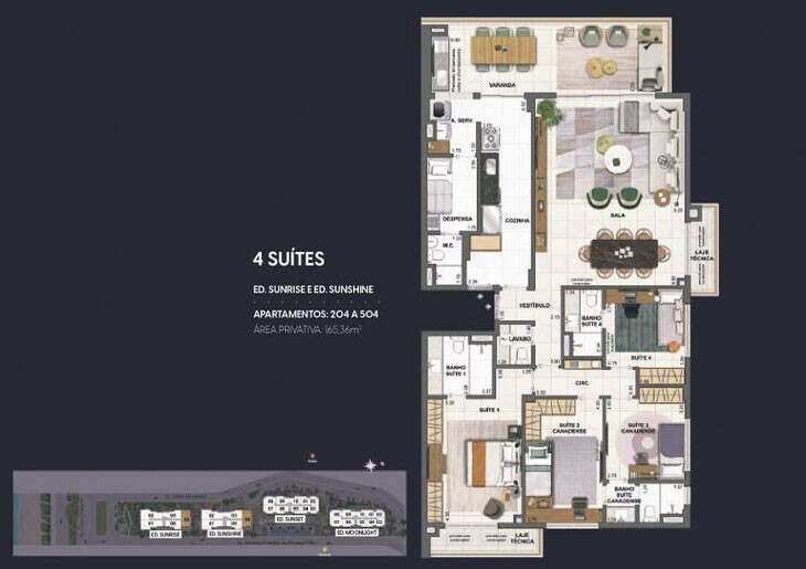 - Piso da sala, de todas as suítes, da área de circulação e do terraço são em porcelanato;