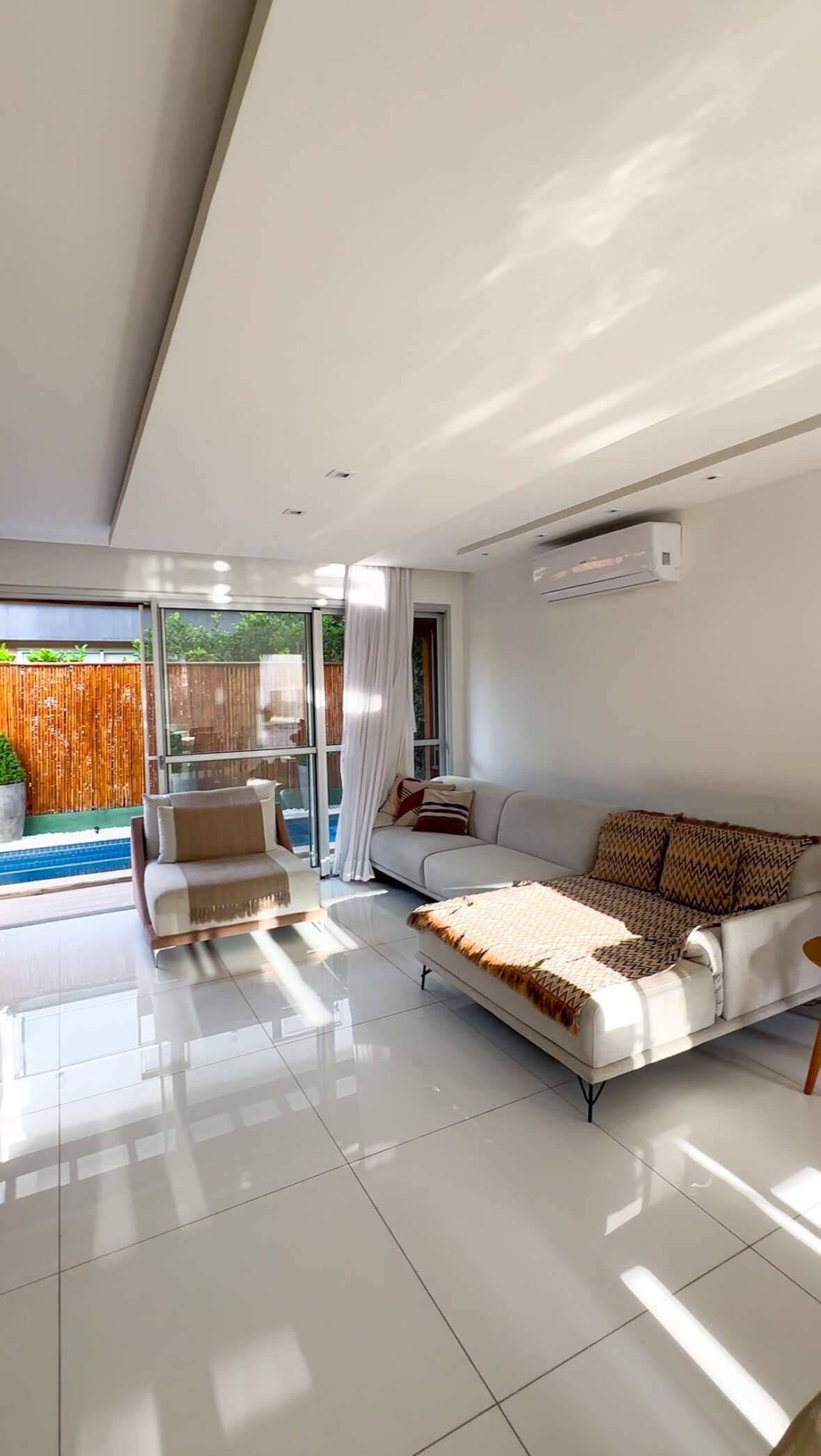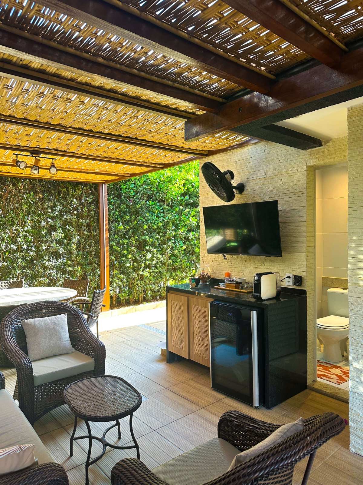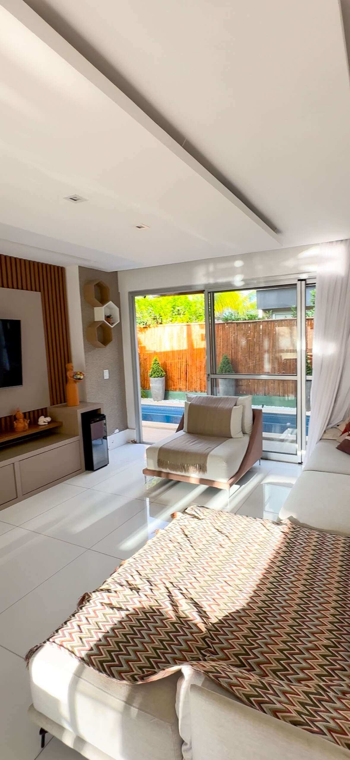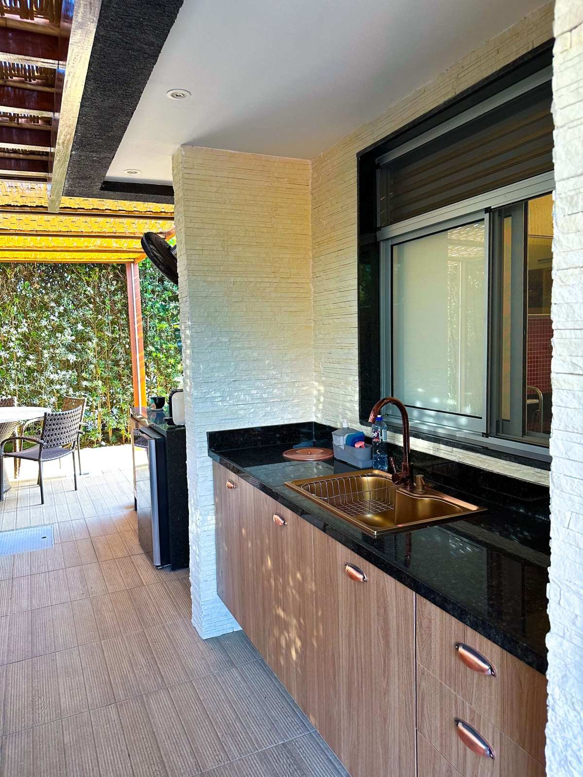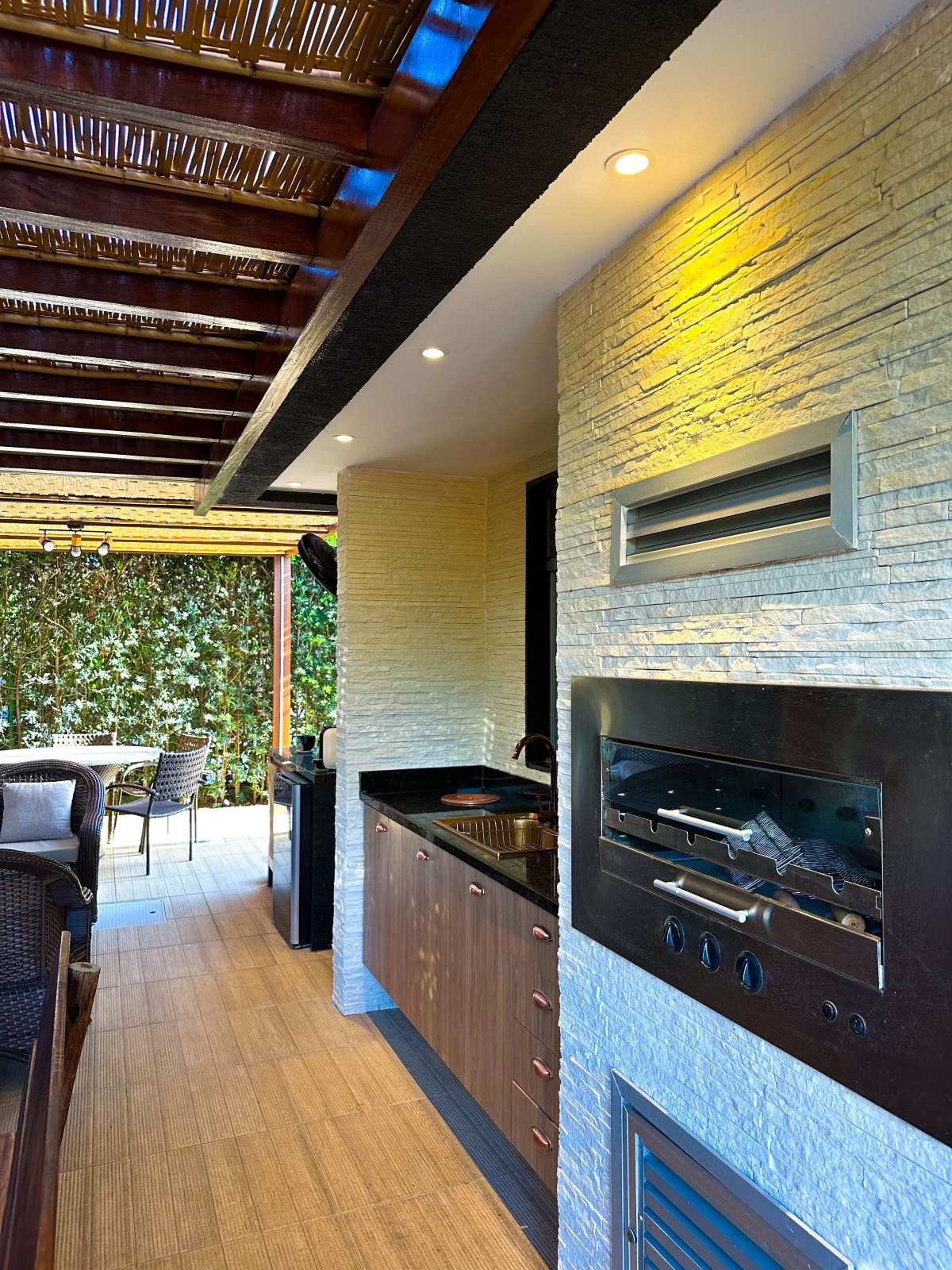 - Área gourmet coberta com colicarbonato e rebaixo em bambu com churrasqueira e bancada de apoio;