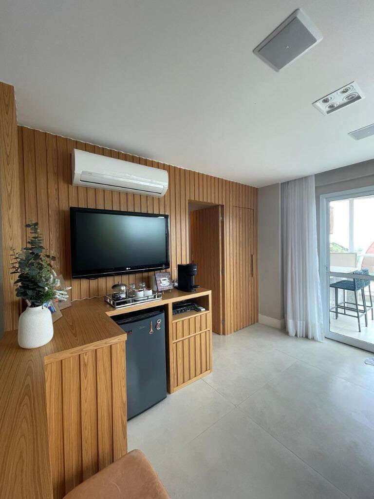 - Sala de tv com rack painel e revestimento em painel ripado, além de sistema de som embutido;