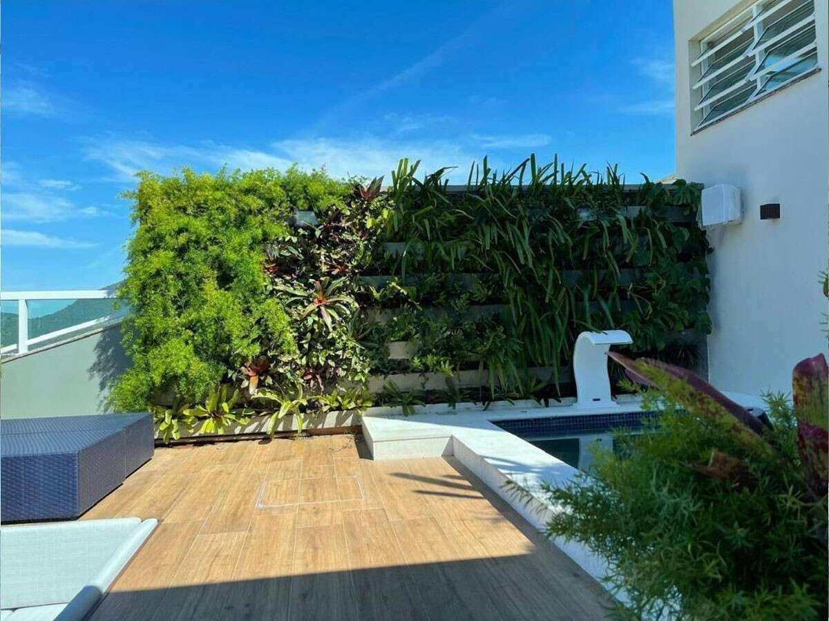 - Piscina com casacata e guarda corpo com jardim suspenso com irrigação automatizada;