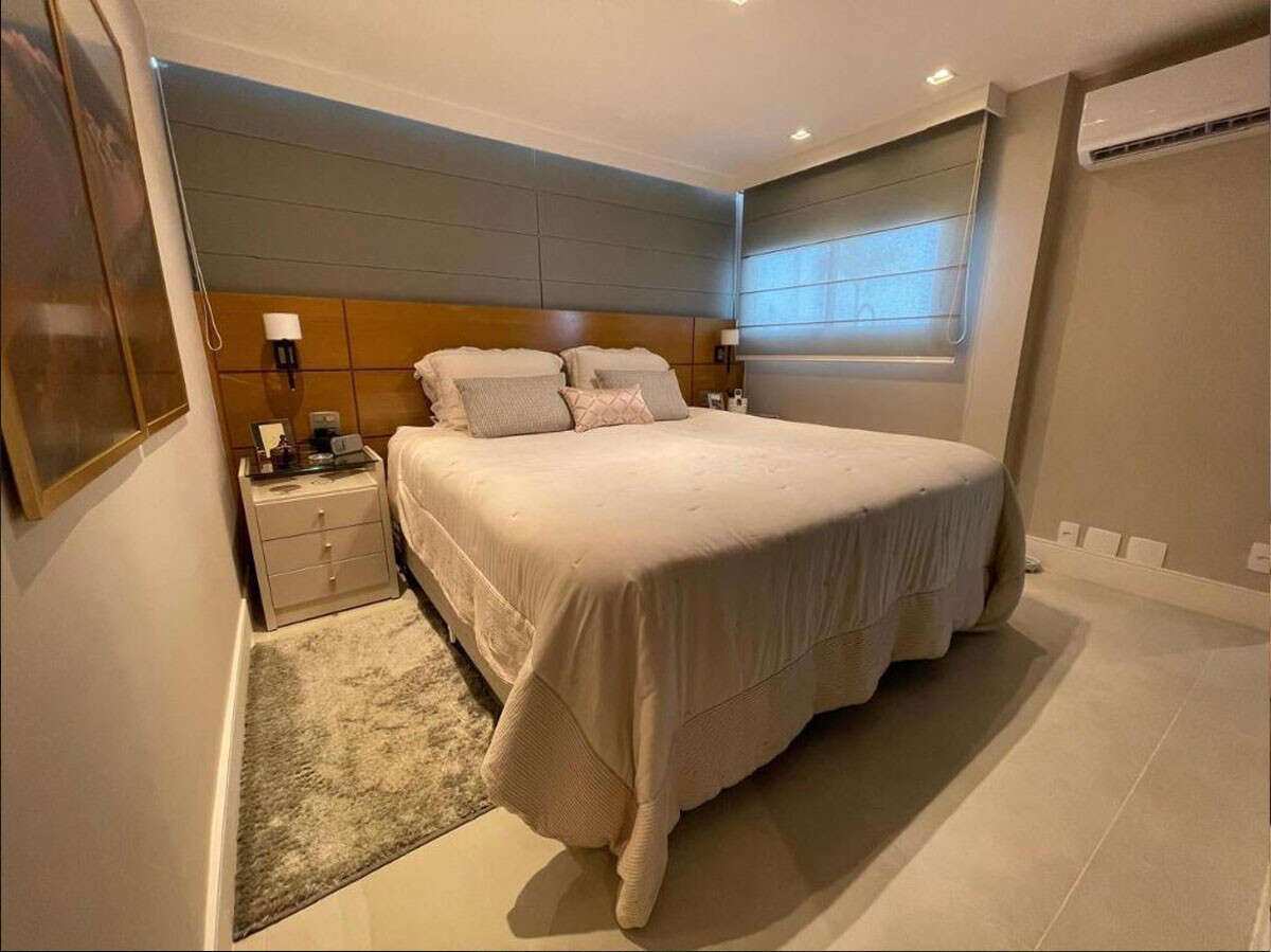 - 01 suíte master com cabeceira com iluminação em arandelas, ar e closet;
