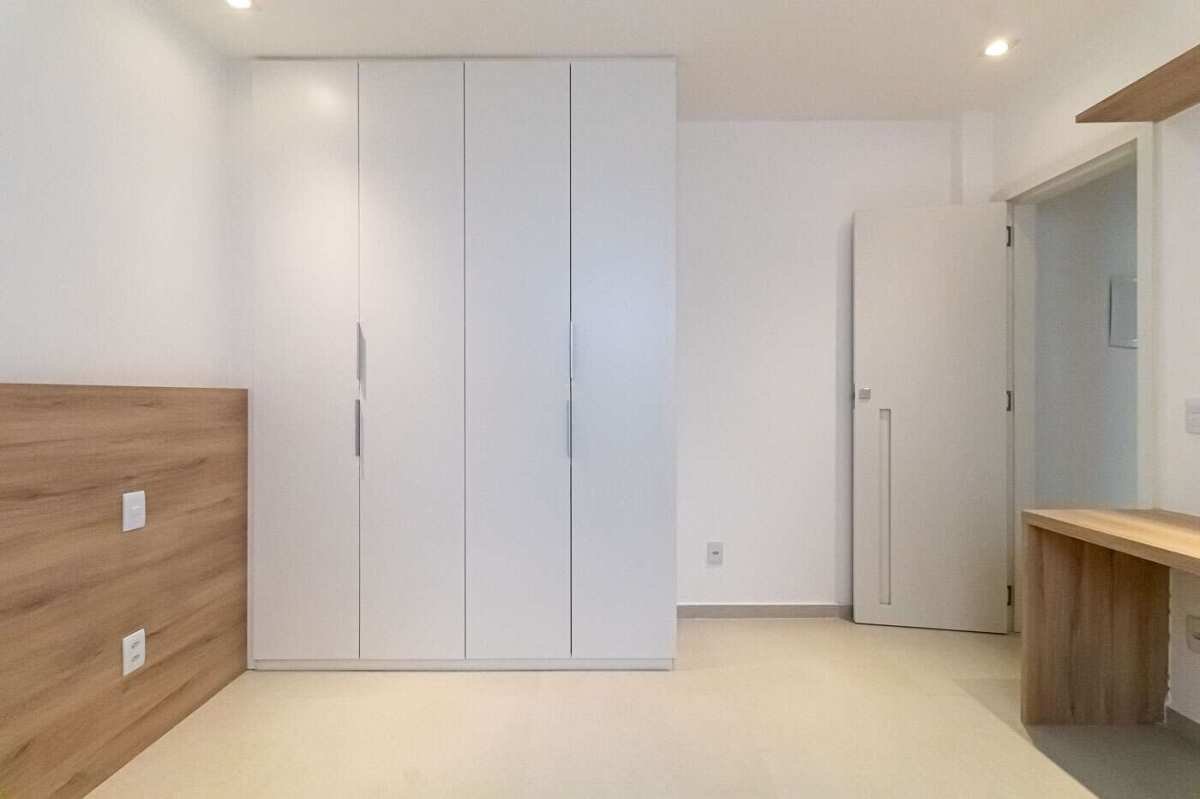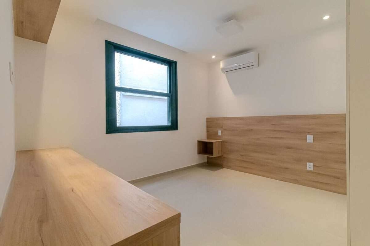 - Quarto com preparação para TV, armário, mesa lateral e painel de cabeceira, mesa de trabalho e split;